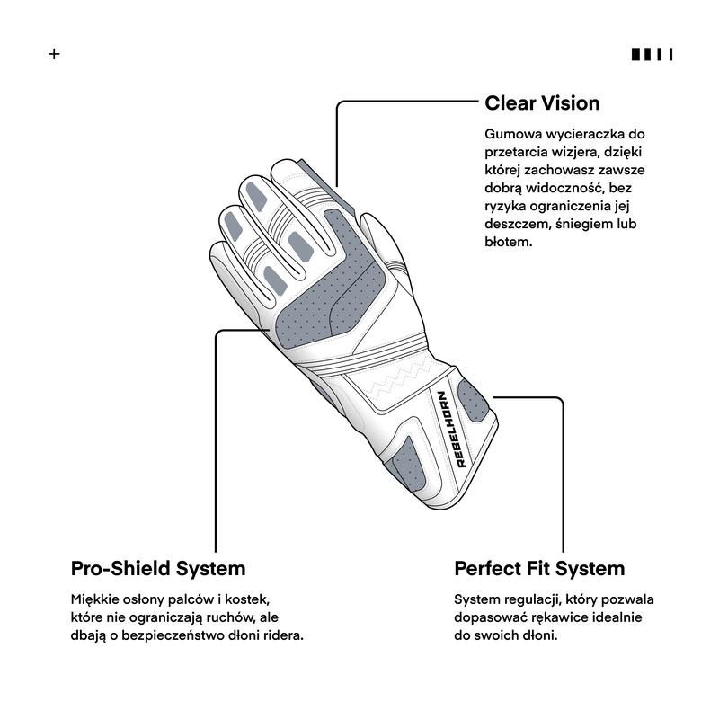 Rękawice motocyklowe skórzane Rebelhorn Hike II to turystyczny model wykonany z miękkiej i wytrzymałej skóry koziej. Dzięki dotykowemu panelowi zapewniają pewny chwyt i dobre wyczucie manetki. Rebelhorn Hike II wyposażono w gumową wycieraczkę dla przetarcia wizjera kasku.