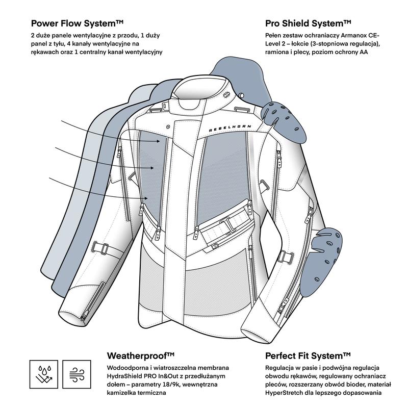 Rebelhorn Hardy 3.0 jest wyposażona w innowacyjną membranę HydraShield™ PRO, którą można założyć na wierzch kurtki lub nosić pod spodem. Dodatkowo, elastyczny materiał HyperStretch® zwiększa ergonomię, a system magnetycznego zapięcia umożliwia wygodne otwieranie wentylacji podczas jazdy.