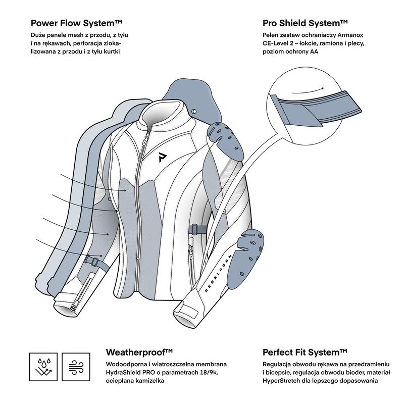Kurtka Rebelhorn Hiflow V wyposażona jest w ochraniacze Armanox na łokciach, barkach i plecach oraz spełnia wymaganianormy CE na poziomie AA. Ochraniacze łokci mają regulowaną pozycję, co pozwala na idealne dopasowanie.